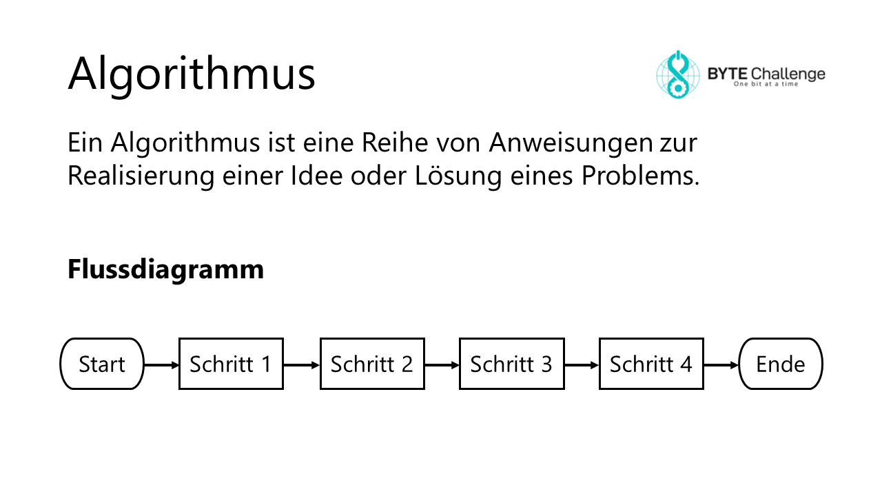 Man kann die Schritte auch in Kästchen schreiben und durch Pfeile verbinden, das nennt man dann Flussdiagramm. Wichtig ist hierbei, den Beginn und das Ende eines Flussdiagramms zu kennzeichnen.