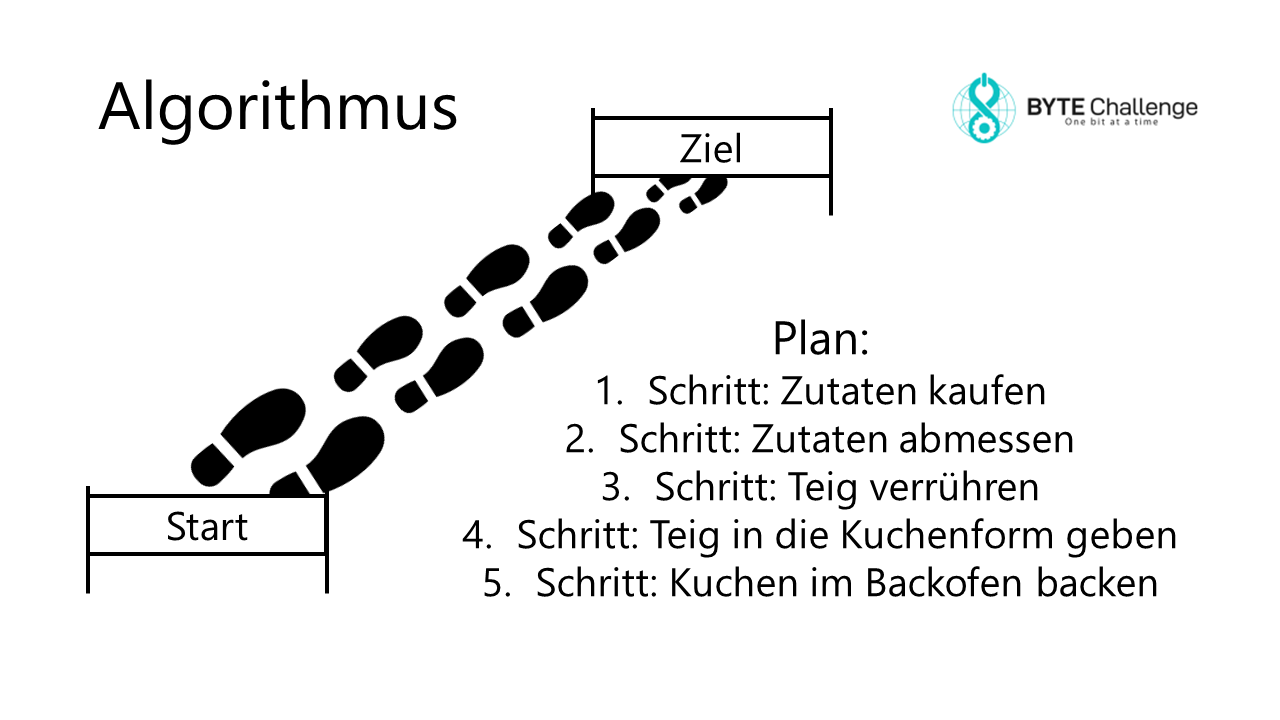 Stelle dir vor, du möchtest einen Kuchen backen. Das ist die Idee und hier kommt der Plan. Im ersten Schritt solltest du die Zutaten kaufen und im zweiten abmessen. Nun verrührst du den Teig und gibst in anschließend in die Kuchenform. Als letzten Schritt lässt du den Kuchen im Backofen backen. Jetzt ist der Kuchen fertig und der Plan ist ausgeführt.